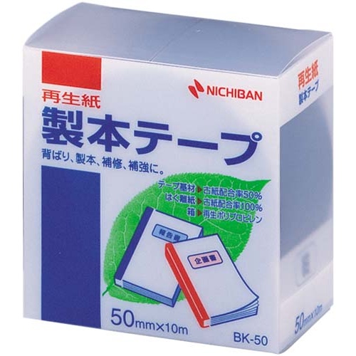 ニチバンの再生紙製本テープ。幅50mm×10mの紺色。環境に優しく、安全な資料作りに最適です!
