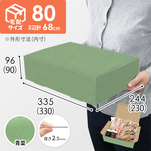 表面に青菜色のカラーライナーを使用した宅配80サイズ対応ダンボール箱。高級感ある見た目に仕上がるため、通販商品の発送やパッケージなどにおすすめです。