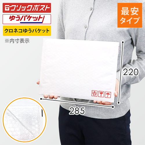業界最安級の価格を実現!ネコポス最大サイズでB5が入る大きさの白色クッション封筒(最安タイプ)。薄くやわらかな仕上がりで口を広げやすく、梱包作業性に優れています。通販発送に最適です。