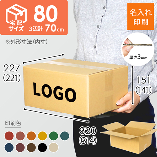 宅配80サイズのダンボール箱に、お客様のロゴや社名などを名入れ印刷します(K-80、M-80、M-80Sと同サイズ)。