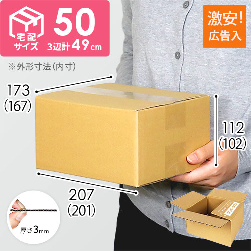 「ダンボールワン」の広告が印刷された、宅配50サイズで発送できるダンボール箱です。