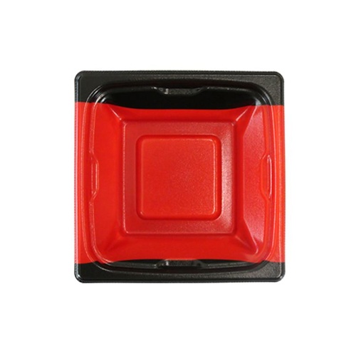 エフピコの「MFP角盛重」本体は、フチ黒赤で料理を上品に魅せるPSP製容器。軽量でテイクアウトやデリバリーに最適です。