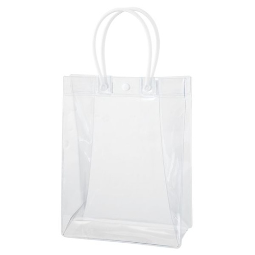 店舗の個性を際立たせるPVCクリア手提げバッグ。ハンドルが倒れず、ラッピング作業もスムーズに行えます。