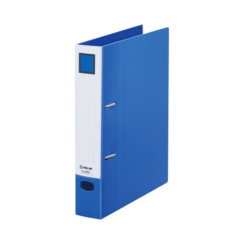 A4横型、青色のレバーリングファイル。約350枚収容可能で、背幅は47mmです。