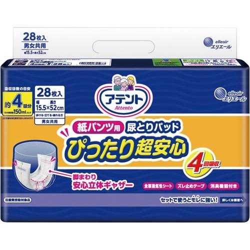 アテント紙パンツ用パッドは、脚まわりからのモレを防ぎ、長時間安心の吸収力。全面通気性シートでムレを防ぎ、お肌にやさしい!
