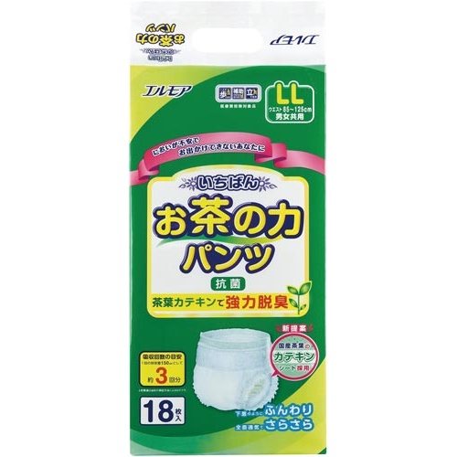 カミ商事のエルモアいちばん。お茶のカテキンパワーで気になるニオイとカブレをケア。L〜LLサイズ、18枚入り。
