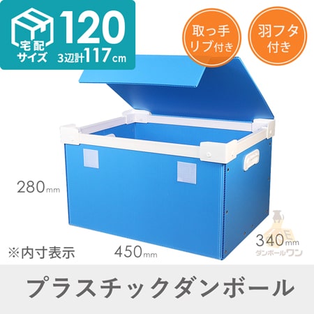 内寸:450×340×280mm、宅配120サイズのプラダン製コンテナです。部品・書類等の保管や輸送用として、繰り返し利用可能な通い箱として便利です。