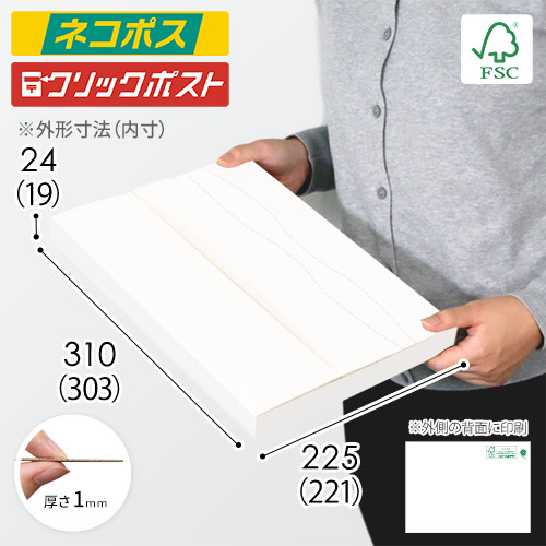 FSC認証紙を利用した、厚さ2.5cm・底面A4サイズの白色メール便ケース。クロネコゆうパケットやクリックポスト、ゆうパケットなどに対応しています。A4サイズの冊子や通販商品に。