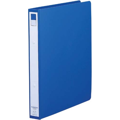 A4タテ型、青色のリングファイル。書類がフラットになりやすい構造で、静かに開閉できます。約200枚収容可能!