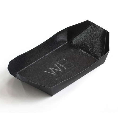再生紙とPP加工で環境に優しく衛生的。たこ焼きはもちろん、罫線を折れば長い食品にも対応するワイド舟型紙トレーです。