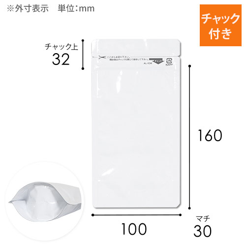 長期保存に適したアルミ素材で100×192(160)×30mm・白色のラミネート袋。ディスプレイしやすく、出し入れも簡単なスタンドパックです。大手メーカーによる日本製の商品なので、長期保存するような食品も安心してご利用いただけます。