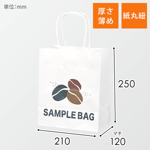 210×120×250mmで丸紐・白色のオリジナル印刷紙袋。小ロットから手軽に作れるため、はじめてオリジナル紙袋を作る方や今の紙袋を見直したい方におすすめです。
