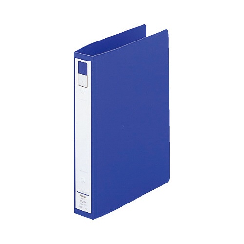 B6横型、青色のリングファイル。片方のリングをひねるだけで簡単に開閉でき、書類もフラットに。