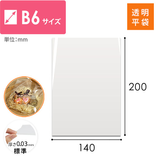 B6が入る大きさの透明OPP袋。封入しやすく、安価にお買い求めいただけるテープ無しタイプ。標準的な厚さ0.03mmの袋で、パリッとした質感や透明度の高さが特徴です。ラッピングや商品梱包、同封書類の保護などにいかがでしょうか。