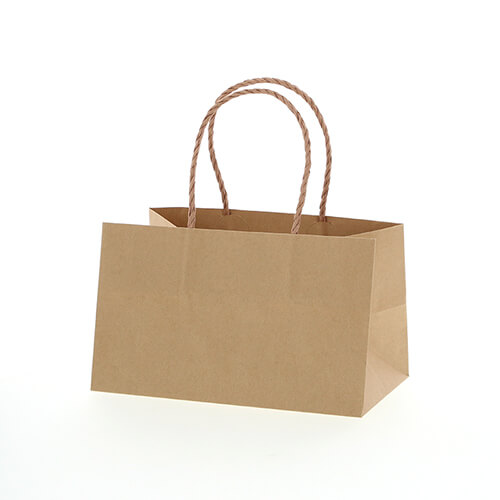 マチが広くて高さが低い安定感のあるクラフトの手提げ紙袋。ケーキショップやカフェなどで、ケーキや容器入りの軽食などの持ち帰りにおすすめです。