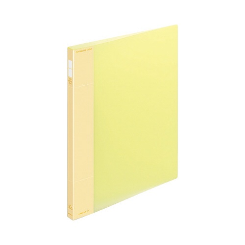 A4タテ型、黄色のリングファイル。棚から取り出しやすいフィンガーホール付きで、約170枚収容可能。