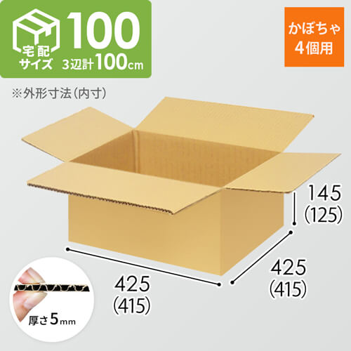 かぼちゃ4個用のダンボール箱(宅配100サイズ)。内寸サイズは415×415×125mmで、かぼちゃの梱包にピッタリなサイズです。