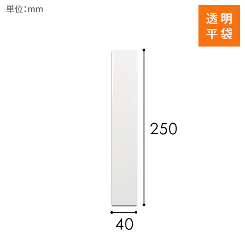 40mm×250mmのOPP袋です。0.03mm厚の透明でパリッとした質感が特徴。商品を汚れや水濡れから守り、商品の発送に便利です。