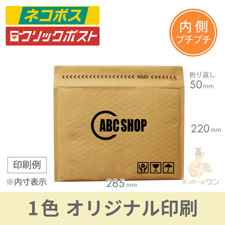 ネコポス・ゆうパケット最大サイズのクッション封筒に、お客様のロゴや社名などを1色で名入れ印刷します。ご注文からお届けまでに40日〜60日かかります。