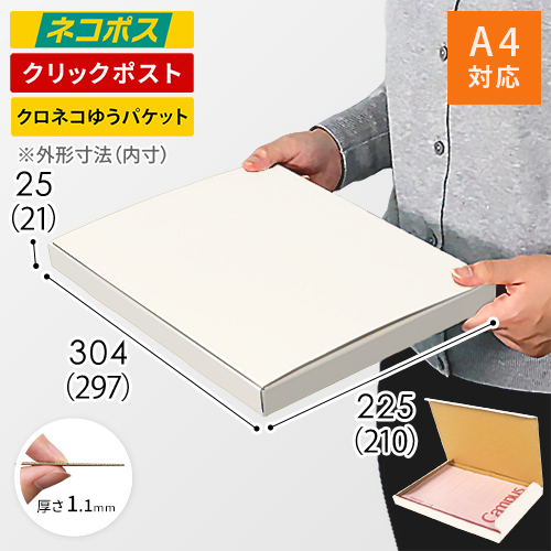 ネコポス・クリックポストに対応!A4サイズ・厚さ2.5cmの白色N式メール便ケース。