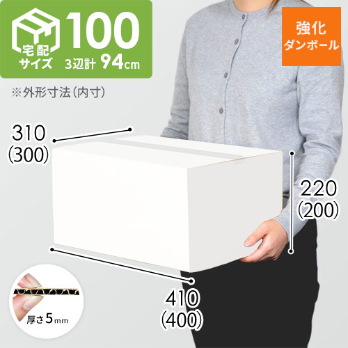 厚み・材質を強化した、宅配100サイズで発送できる白ダンボール箱。通販ギフト発送やパッケージなどにおすすめです。