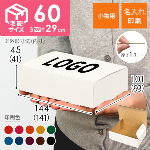 社名やロゴ等のお客様オリジナルデザインを印刷した、宅配60サイズで発送できる底面A5の白色ダンボール箱です。