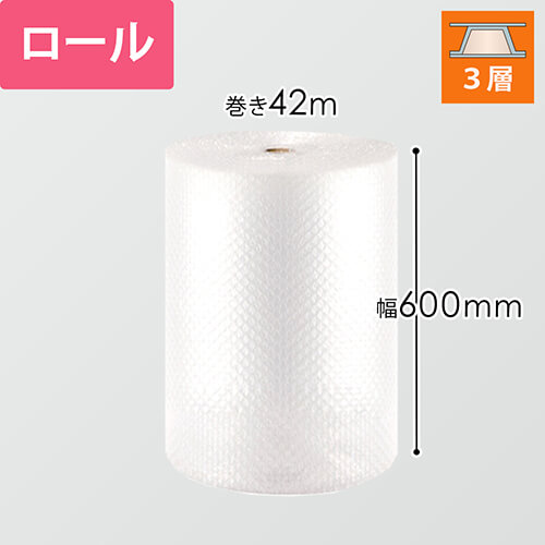 重量物にも使える3層構造のプチプチロール。幅600mm×42mで、精密機器や割れ物などの大量包装に便利!外側内側とも凹凸なく、耐久性があり繰り返し使用できます。