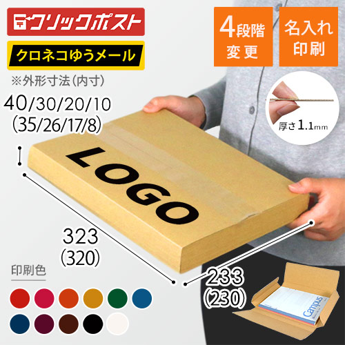 厚さ1〜4cmに変更可能!社名やロゴ等のお客様オリジナルデザインを印刷した、ゆうパケット・定形外郵便対応のヤッコ型メール便ケースです。