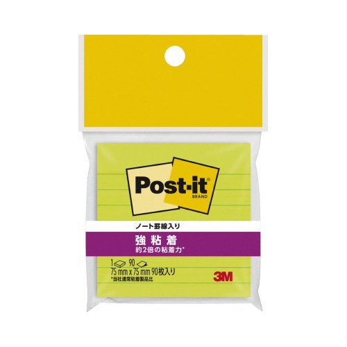 強粘着タイプのポストイット。75×75mm、罫線入り、アシッドライム、90枚入り。