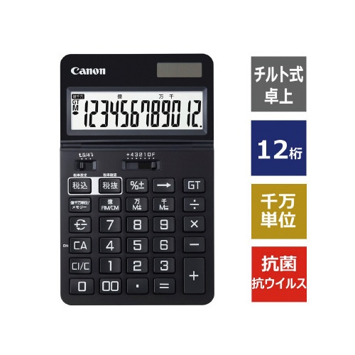 12桁表示、チルトディスプレイ、太陽電池+リチウム電池のハイブリッド電源。抗菌・抗ウイルス対応で清潔に使えるビジネス電卓。