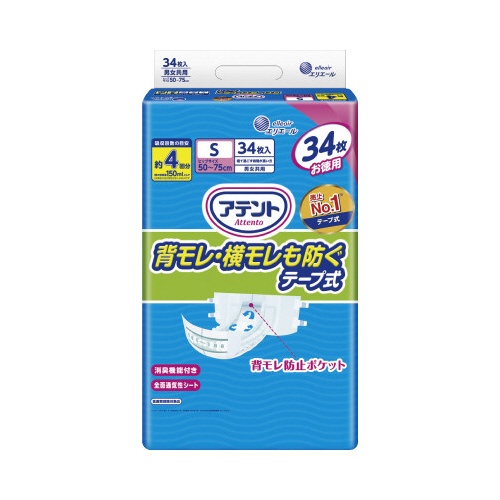 消臭効果付きテープ式Sサイズ。34枚×2パック入りでたっぷり使えます。約4回分吸収で長時間安心!
