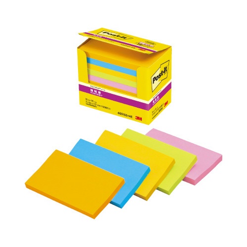 強粘着タイプで、樹脂面にもしっかり貼れてきれいにはがせる大判ポストイット。ネオンカラーの10冊パックです。