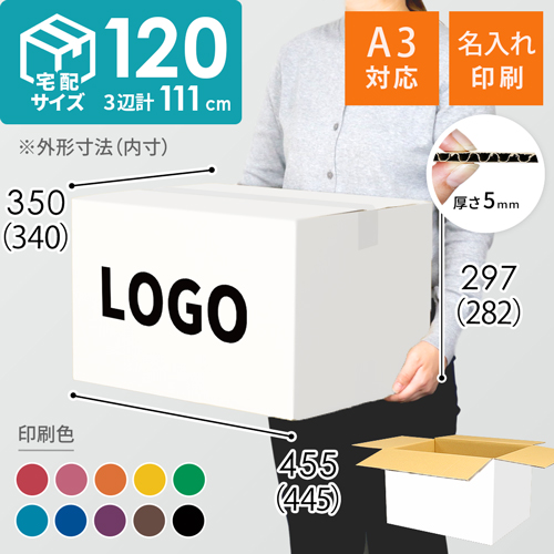 宅配120サイズの白色ダンボール箱に、お客様のロゴや社名などを名入れ印刷します。(AZ-120と同サイズ)