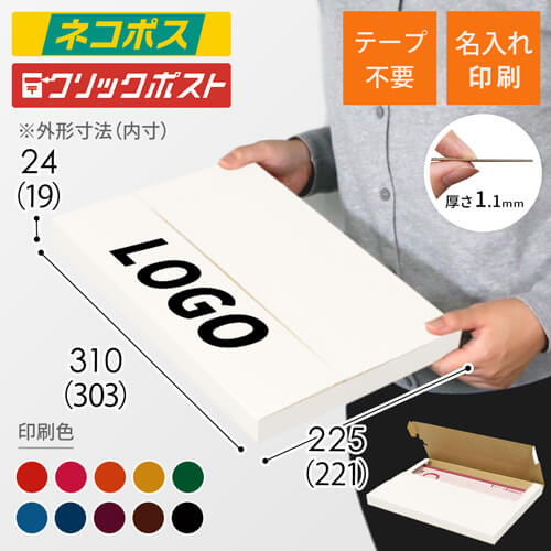 社名やロゴ等のお客様オリジナルデザインを印刷した、ネコポス・クリックポスト対応の白色メール便ケースです。テープレス仕様で梱包・発送の作業も簡単。