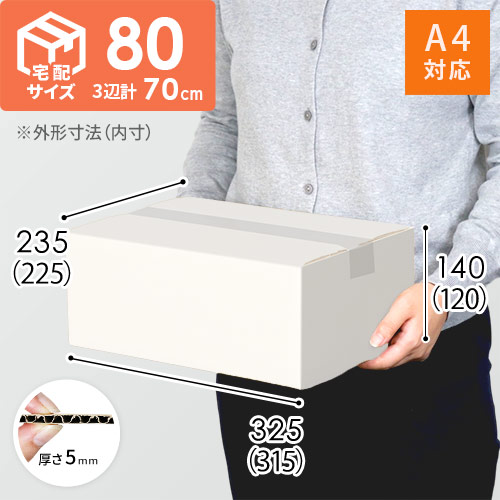 宅配80サイズで発送できる底面A4の白ダンボール箱。通販ギフト発送やパッケージなどにおすすめです。