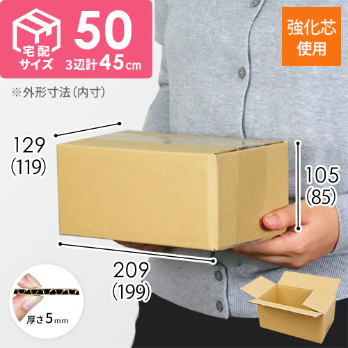 厚み・材質を強化した宅配50サイズのダンボール箱。3辺合計が45cmの小さいタイプで、小型商品でも緩衝材の量を抑えて発送することができます。精密機器や重量物に。