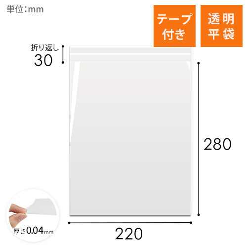220mm×280mmのテープ付きOPP袋です。少し厚めの0.04mm厚の透明でパリッとした質感が特徴。商品を汚れや水濡れから守り、商品の発送に便利です。
