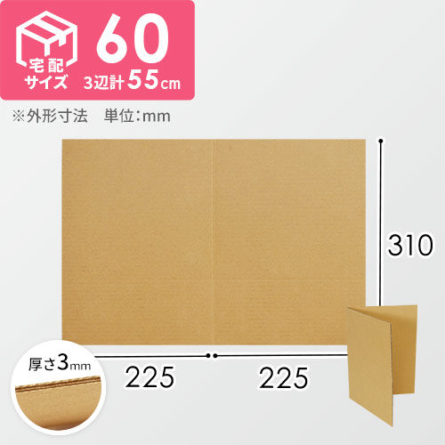 3辺合計が59cmで、宅配60サイズの薄型ダンボール箱。サイズは長さ250×幅250×深さ60mmで、底面が正方形です。アパレル商品や丸形の掛け時計などの発送、収納に便利。
