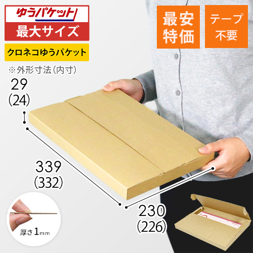 大幅なコストダウンによって業界最安級の価格を実現!ゆうパケット最大のメール便ケース。厚さ3cm、底面A4サイズで通販発送に最適。クリックポストにも対応しています。