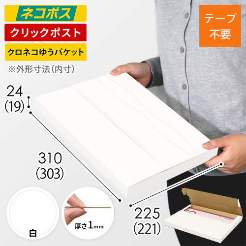 表面に白色のカラーライナーを使用したメール便ケース。高級感ある見た目に仕上がるため、通販商品の発送やパッケージなどにおすすめです。