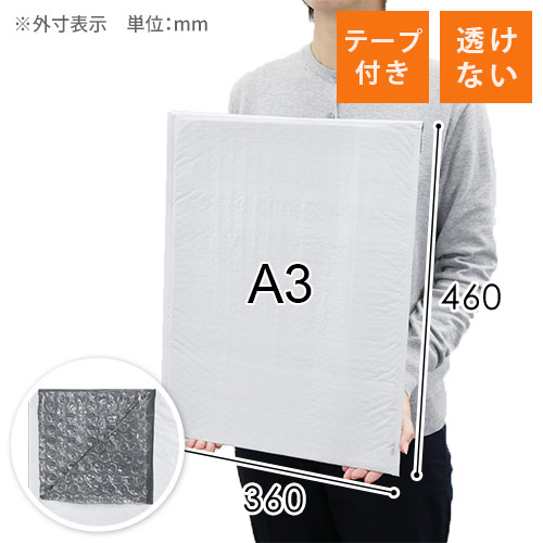 内側にエアーキャップ(気泡緩衝材)が付いたビニール製封筒(A3サイズ)で、水濡れや破れに強く内容物をしっかり保護します。