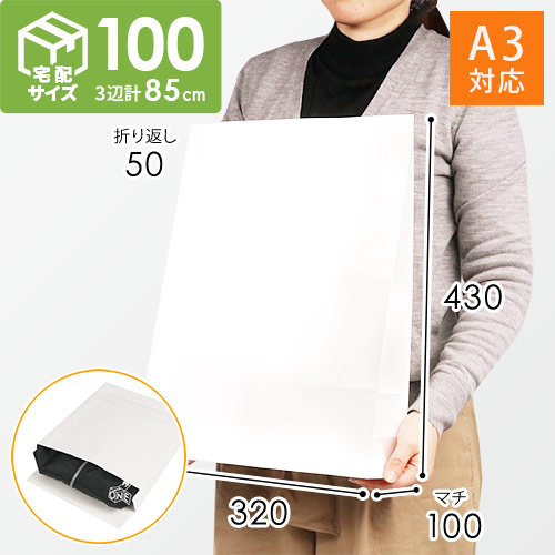A3サイズまで対応した白無地・マチ付き・テープ付き宅配袋(角底袋)。洋服や書類の発送に便利です。