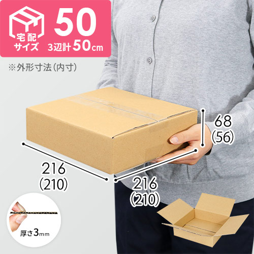宅配60サイズで発送できる薄型のダンボール箱。サイズは長さ210×幅210×深さ56mmで、底面は正方形です。アパレル商品やお皿・陶磁器などの発送・収納用に。