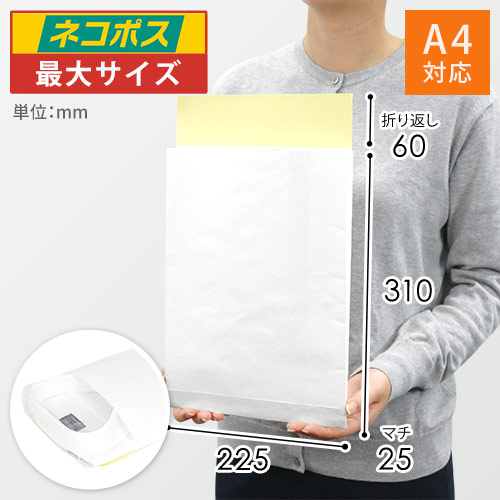 ネコポス最大サイズ!A4サイズまで対応した白無地・サイドマチ付き・テープ付き宅配袋。洋服や書類の発送に便利です。