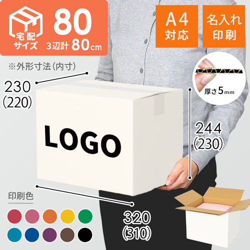 宅配80サイズの白色ダンボール箱に、お客様のロゴや社名などを名入れ印刷します。(A4-80と同サイズ)
