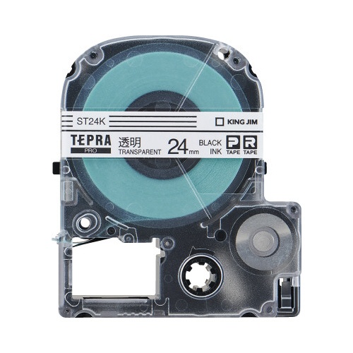 24mm幅、黒文字の透明ラベルテープ5個パック。簡易包装でゴミ削減!