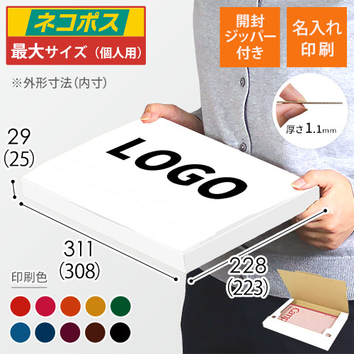 社名やロゴ等のお客様オリジナルデザインを印刷した、ネコポス・クリックポスト対応の白色N式メール便ケースです。「メルカリ ネコポス用ダンボール箱」と同サイズ。