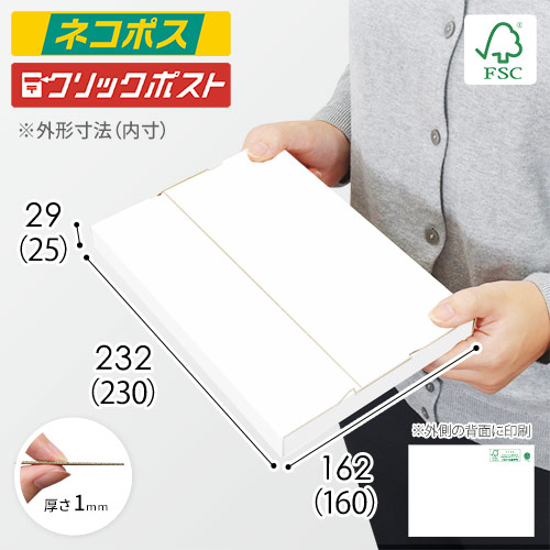 FSC認証紙を利用した厚さ2.5cm・A4対応の白色メール便ケース。クロネコゆうパケット・クリックポスト・ゆうパケット・定形外郵便(規格内)などに対応しています。通販商品の発送に。