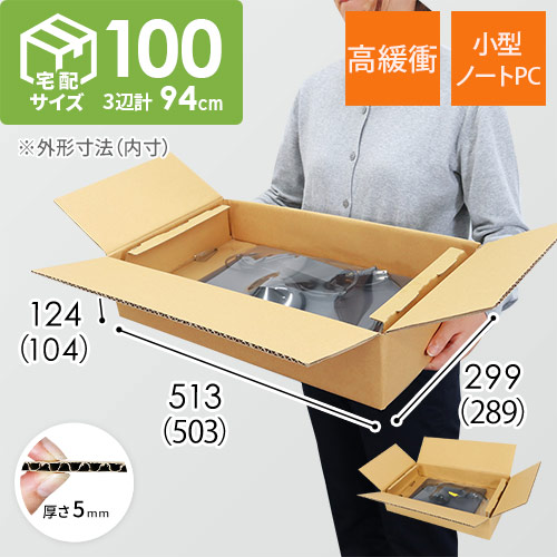 ノートPCを保護・緩衝しながら発送できる、宅配100サイズのダンボール箱。フィルム付きパットが付属されており、リモートワークの準備や精密機器の通販発送に便利です。