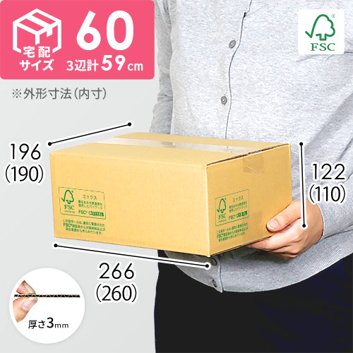 FSC認証紙を利用したダンボール箱。宅配60サイズに対応しています。森林保全につながるFSCラベル付きの製品です。